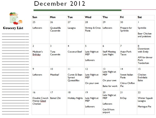 So far so good on the meal planning. We actually had more food than necessary with the initial plan so I changed things up. I’m not going to even plan for the last week of December because it will be crazy with the holidays and B being home. This is the four week plan. A lot is new so we’ll see how it goes. So far I can say the Quesadilla Casserole and Orzo Pasta are really good.