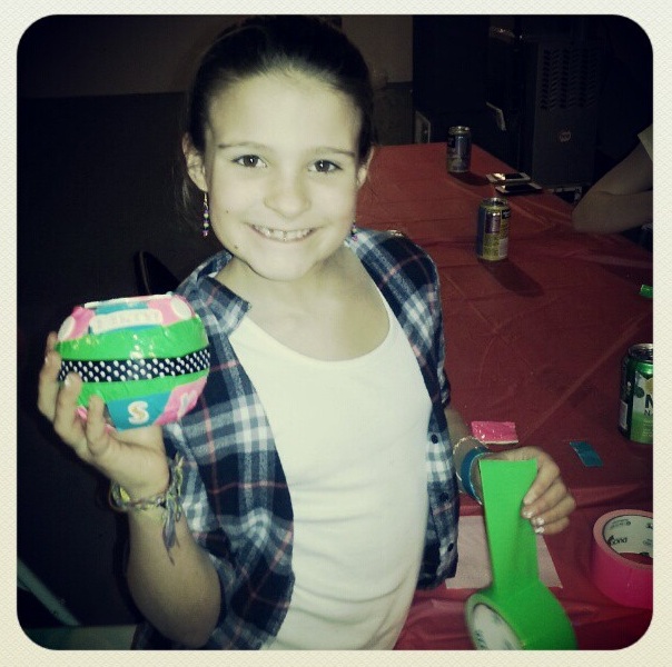 The girls started the evening with arts and crafts. I had the girls make Happiness jars and they had a good time with it. I made the smart move to get duct tape and it kept them busy for a long time. The highlight for the girls was dressing up in my clothes. They spent nearly two hours exchanging dress, getting pictures taken and doing fashion shows. Although I borrowed princess clothes from Lindsey for Erin and she loved them. When all the girls put on my dresses she wanted to put on a “dress” too. I managed to convince her that my shirt was a dress.