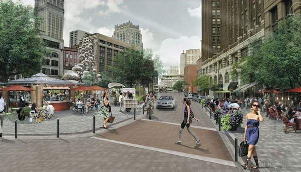 Placemaking is the word of the day here in the D. Our billionaire patron, Dan Gilbert, had a pep rally to reveal his long term plans for downtown. I watched about 30 minutes of the event as it streamed this afternoon and was impressed. He’s working hard to make Detroit a great place. He’s carved out his part of town [below] and is covering every base to ensure it is successful. He started by bringing jobs to the city and now he’s focusing on the residential and retail side of things.