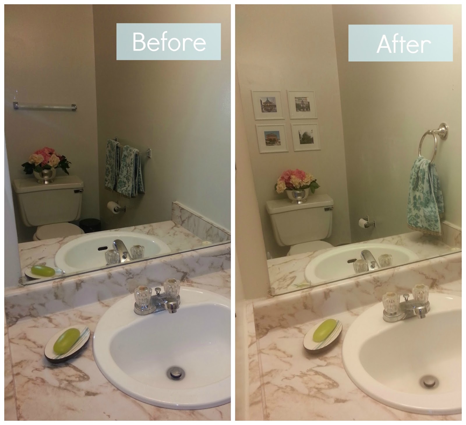 I loved decorating our first apartment but it was a lot of work for not too much time spent there. I wanted to be sure to avoid that mistake this time around. At the same time I wanted to give our current home a homey feel and some Detroit accents were a must. I pulled out the photos we had in our old apartment for the bathroom and removed the unnecessary hardware to make it look a bit more chic. I also upgraded the frames and found a pack of four at Michael’s for $20.