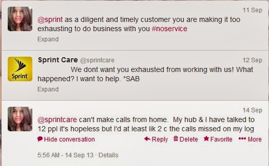 If you have a concern with a corporation do not call their 800 number. It’s a waste of time. Danny and I spent months complaining to Sprint that we get no service at home. Our phones were reconfigured and when that didn’t work we were told we could get an Airave for a monthly fee, that there were not Airaves available and that we live in a brick building and sound waves can’t travel through brick. I’d given up in utter frustration and hit up Twitter. A few hours later I got a response.