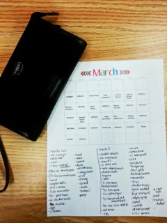 For a time management tool I’ve not only been meal planning but also shopping planning. Saturday is my shopping day and on one piece of paper I write what I need for each weekly trip that month. I go through the recipes and include what we don’t have and cross reference what I’ll have bought in a previous week. I also estimate when we’ll need to resupply household goods. I keep the list in my wallet and make adjustment as needed. This trick has been awesome! I never worry about what I need from the store because it’s easily accessible at all times.