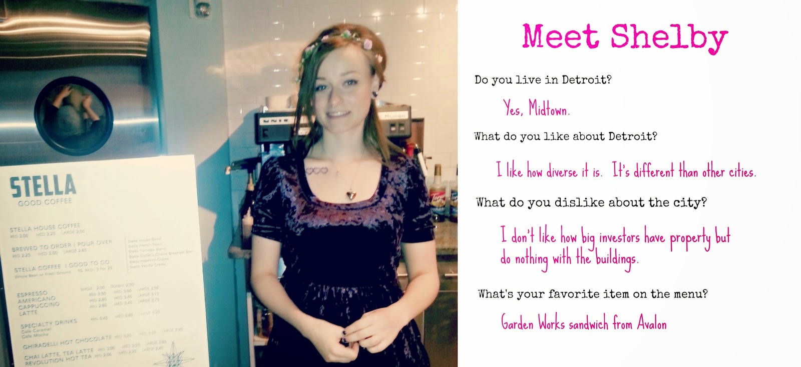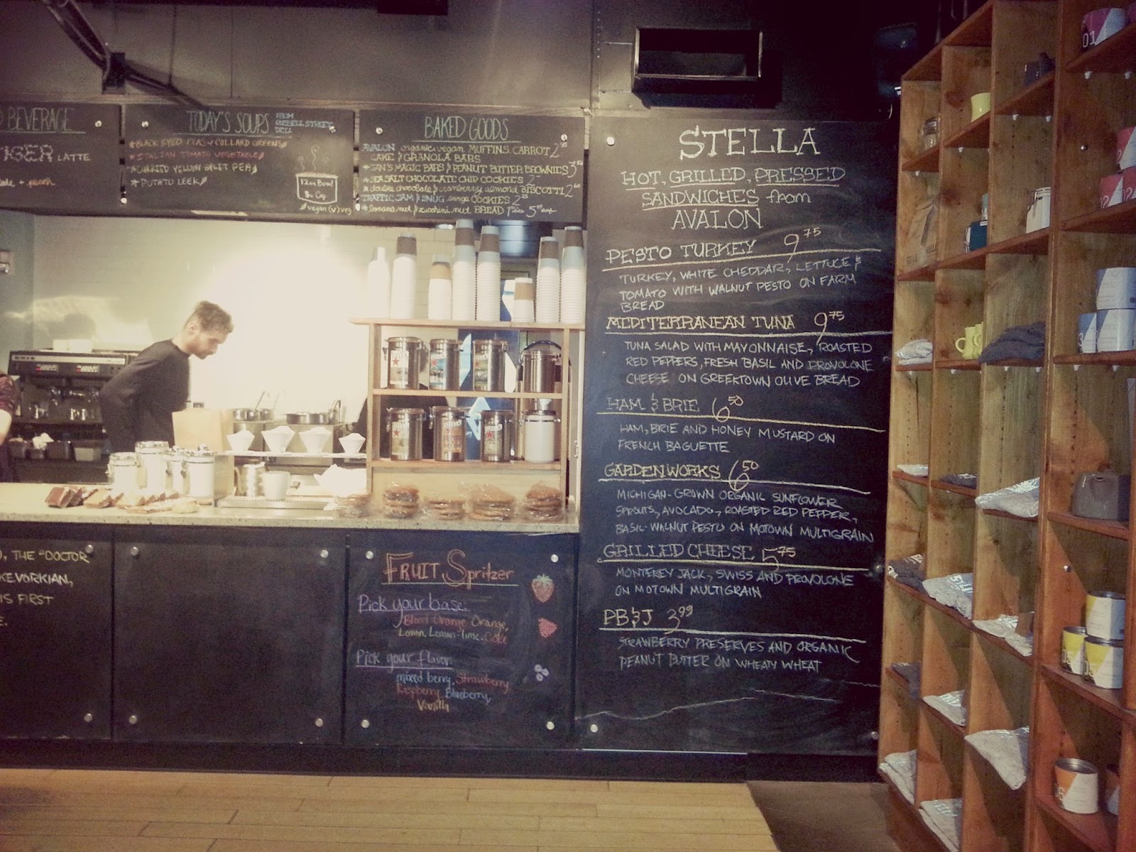 Stella’s is hidden on the ground floor of the building but people find it.  Don’t let this picture fool you.  It was just my luck that the shop was empty for the picture.  By the time I ordered my coffee and asked for an interview, people started lining up.  I waited 10 minutes for a dozen people to be served before I asked my questions.  Stella’s sells coffee, soups, sandwiches and desserts.  They make some things there but they also serve food from Avalon.  Usually I stick to a cafe au lait but today I tried their special: The Baby Tiger latte.  Presumably named for our baseball team, it was flavored with white chocolate and peach.  An interesting combination but very tasty.