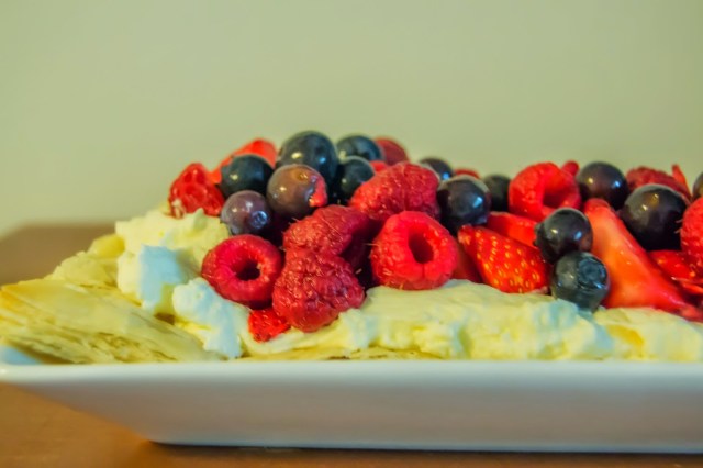 - Cut puff pastry in half and bake until golden (about 10-15 minutes)
