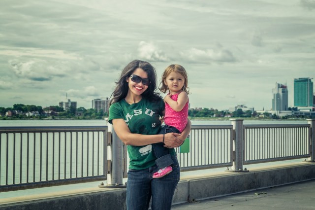 I’m ashamed to admit that it took us until this weekend to make it to the Riverwalk. Well, that’s not exactly true, I have been to the river many times but I haven’t done the walk in its entirety. Since we lost power Friday night we needed somewhere to spend our Saturday morning. It was a cloudy but rain-free day and we took Gwen for a long walk starting at the Renaissance Center and turning around at Harbor Town (so yes, we still have more to do).