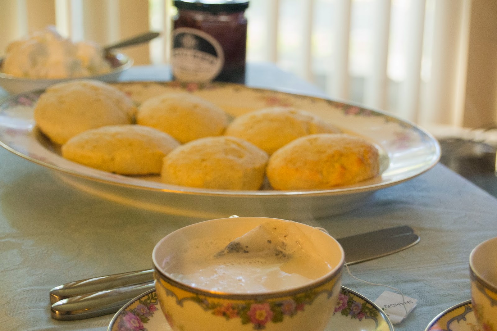 As an Anglophile, I welcome any opportunity to celebrate the English. Conveniently someone on Pinterest shared a link for Mary Berry’s scone recipe from The Telegraph. The recipe is super simple and delicious. Danny ate at least four scones yesterday. For our breakfast I served them with Beau Bien’s strawberry hibiscus preserves and homemade whipped cream. Danny’s preferred method is warmed with drizzled honey and this morning I made a sausage breakfast sandwich.