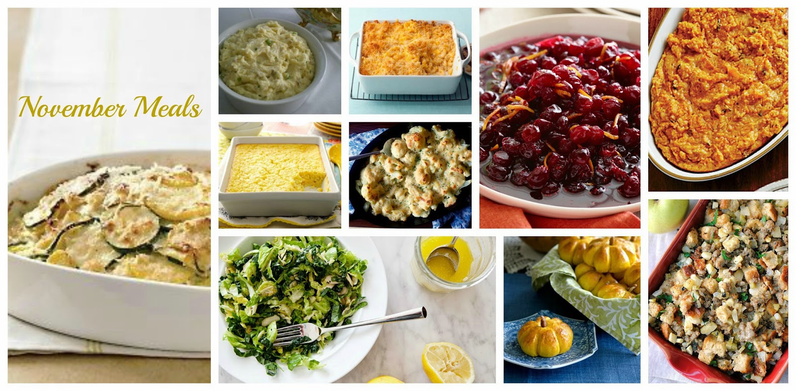 The holiday season is in our midst. I imagine most people will be tasked with bringing a dish to a large gathering at one point or the other in the next few weeks; therefore, November’s meals are really sides. Many of these are my go to favorites: zucchini casserole, cranberries, mac & cheese and corn pudding. The others look worth trying. Here’s to the holidays!