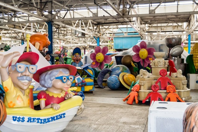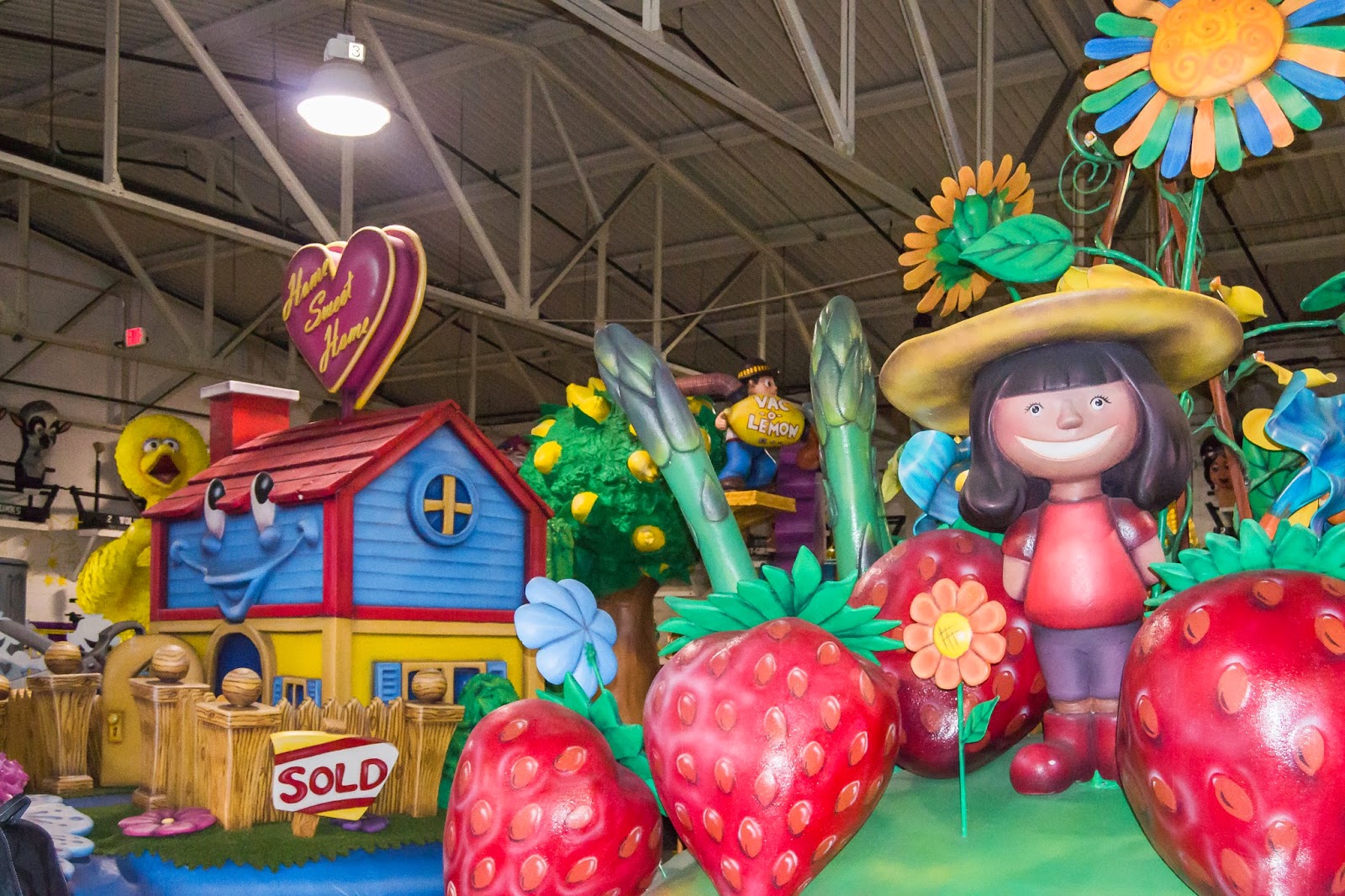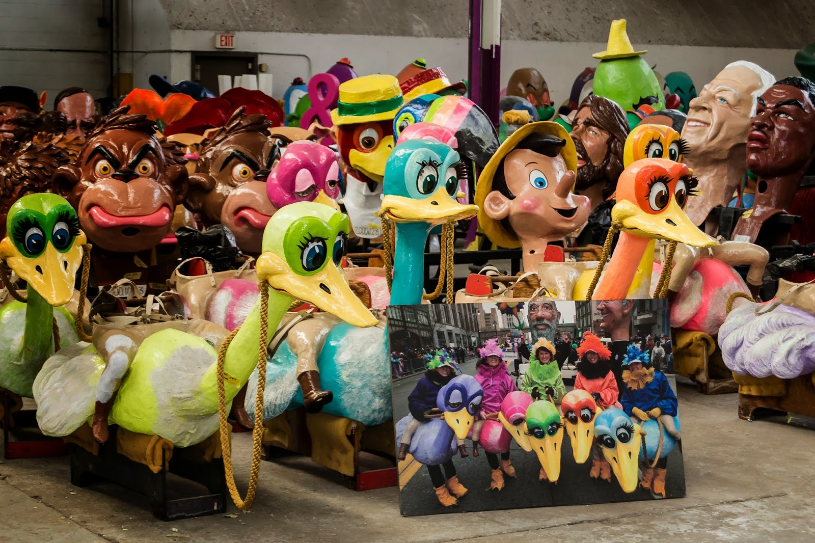 These guys creep Danny out. They’re original Big Heads. The Parade Company used to order them from Italy and return them after the parade. When they learned they were destroyed each year, they asked if they could keep them. The supplier agreed and sent over an artist to train the Parade Company to make their own (see below).