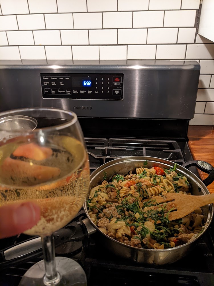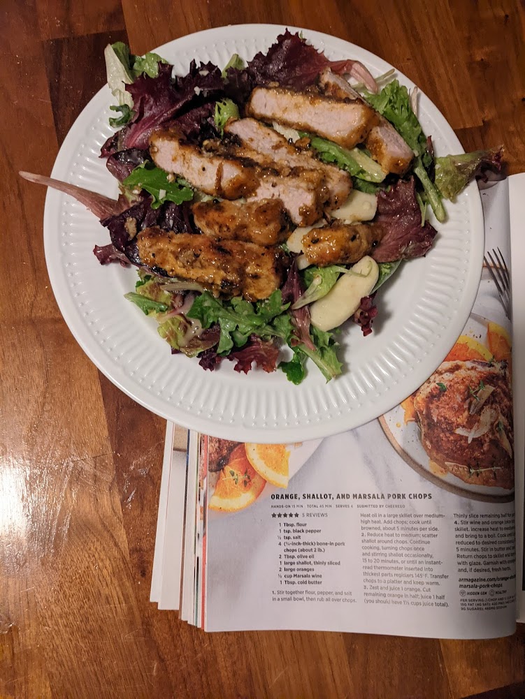 I made two great dinners. A simple goat cheese pasta by Liz Adams and an orange pork recipe with bagged apple salad from TJ. I even made a quiche with leftover ingredients.