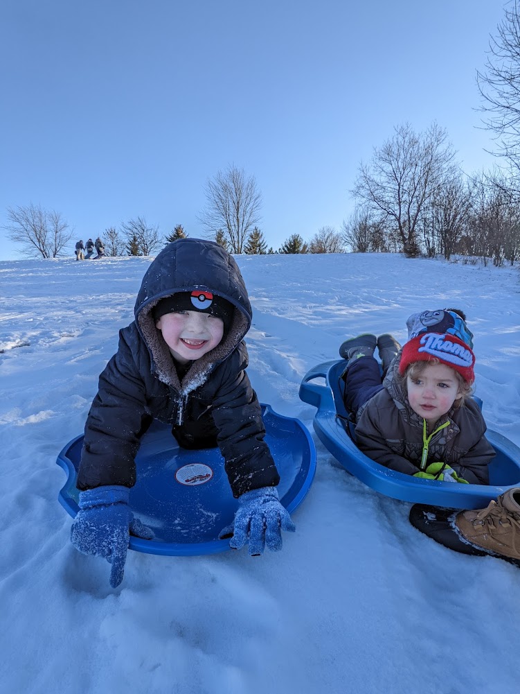 Wednesday after school I took them to Fox Creek Golf Course for sledding and it was the best. The hill is huge and both boys had a blast. The hill is so big that climbing up 1/3 of the way to slide down was entertaining enough for them and we were there for over an hour. The downhill of the activity, was getting both boys up the hill and back down when they were both cold and tired from the fun but we survived.